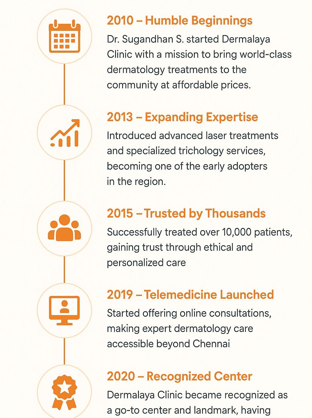 Dermalaya Clinic was founded with a vision to provide comprehensive, ethical, and personalized dermatology care to every patient. From our early beginnings to becoming a trusted name in Chennai for both clinical and cosmetic dermatology, we have always placed patient well-being at the center of everything we do.